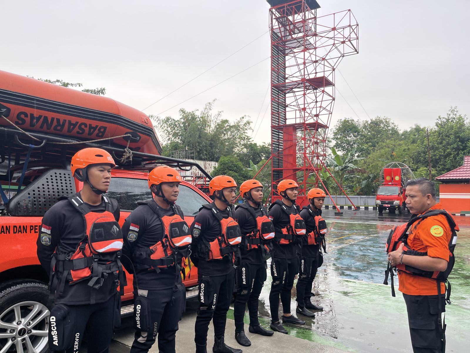 Tim SAR diberangkatkan menuju lokasi kejadian menggunakan satu unit rescue car dengan membawa perlengkapan pencarian dan pertolongan air, termasuk rubber boat, peralatan water rescue, serta dua set alat selam.