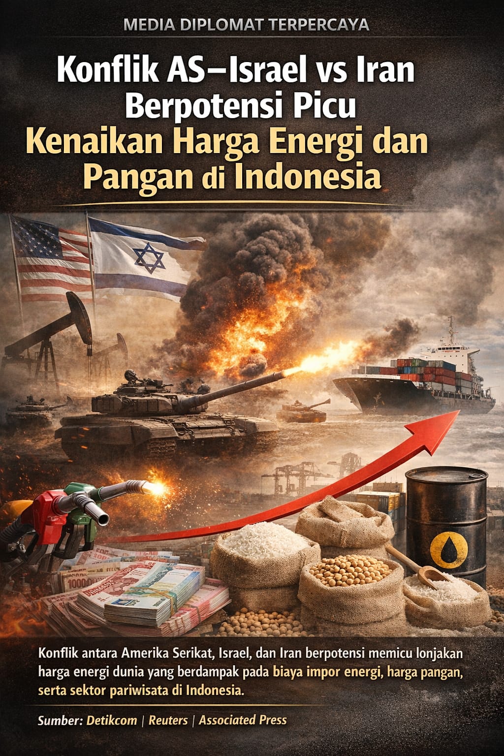 DIPLOMAT TERPERCAYA, JAKARTA – Ketegangan konflik antara Amerika Serikat dan Israel melawan Iran diperkirakan bakal membawa dampak ekonomi yang luas hingga ke Indonesia. Dampak yang paling diwaspadai adalah potensi lonjakan biaya impor energi, kenaikan harga pangan, hingga gangguan pada sektor pariwisata dan transportasi nasional.